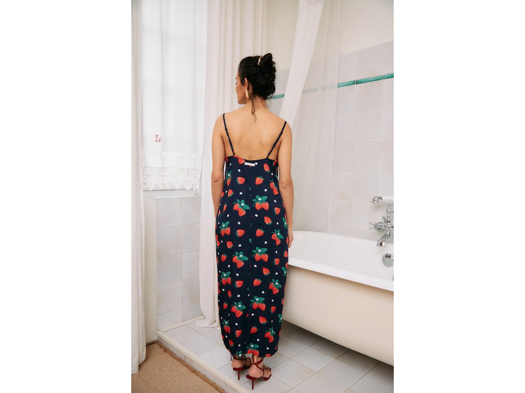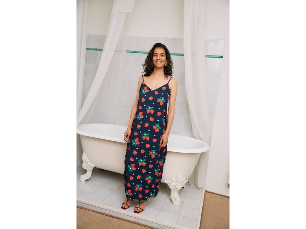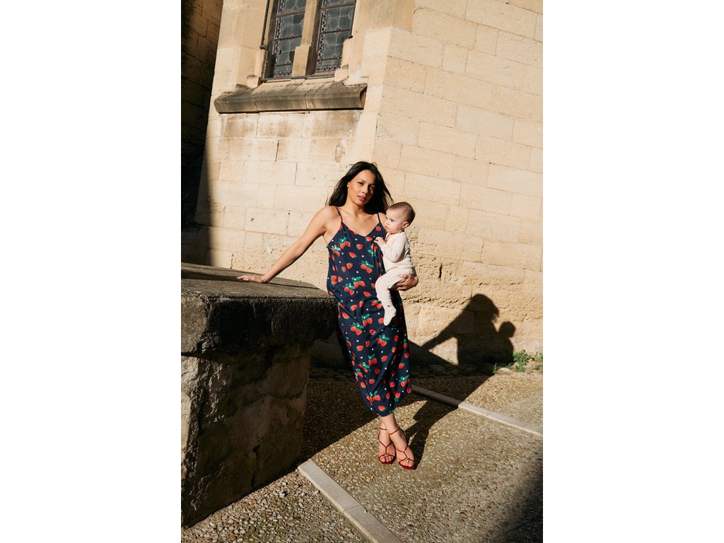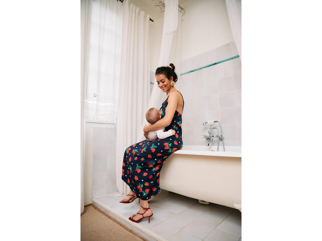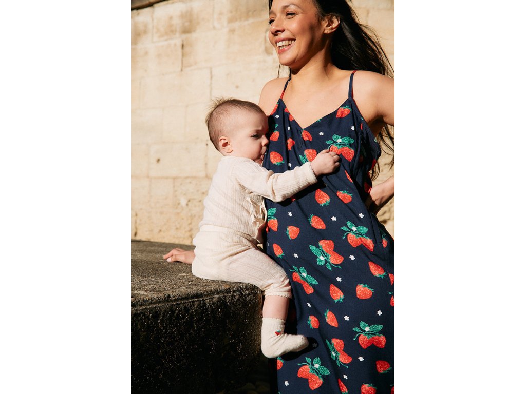 Jednoduché, splývavé, tmavě modré kojící šaty s trendy motivem jahod jsou dokonalou kombinací elegance a praktičnosti pro kojící maminky. Tyto šaty jsou navrženy tak, aby vám poskytly pohodlí a snadný přístup pro kojení, aniž byste museli obětovat váš osobní styl.