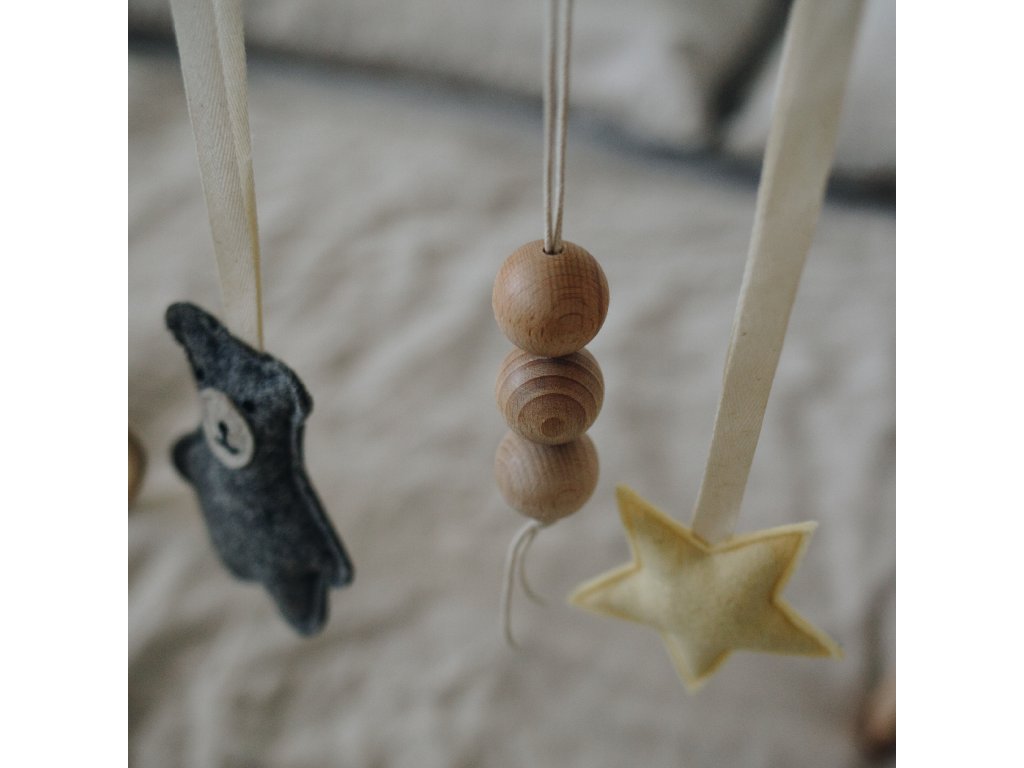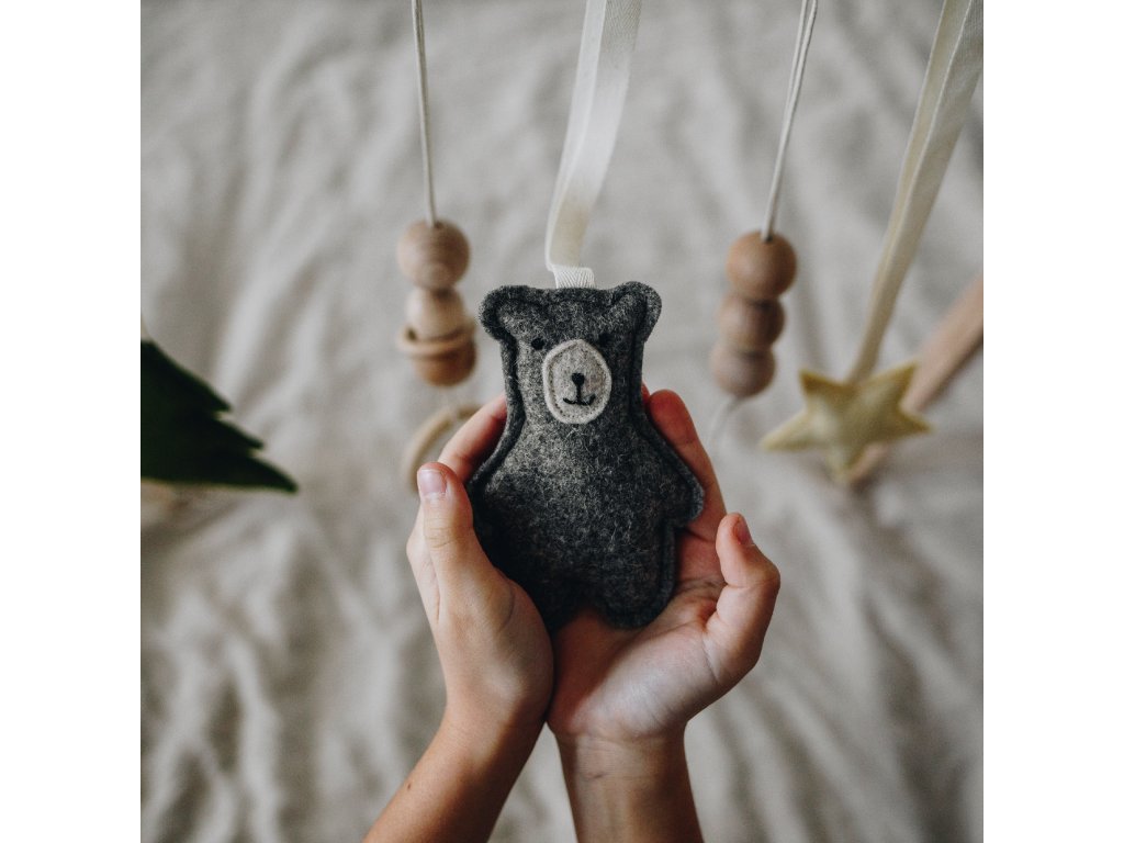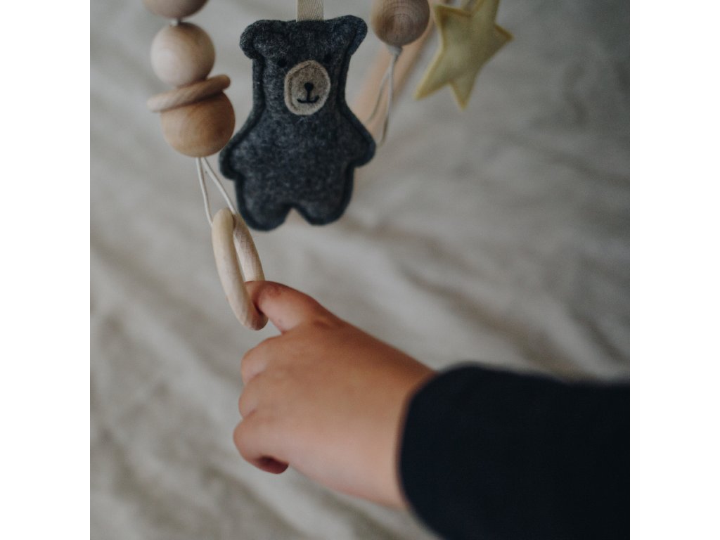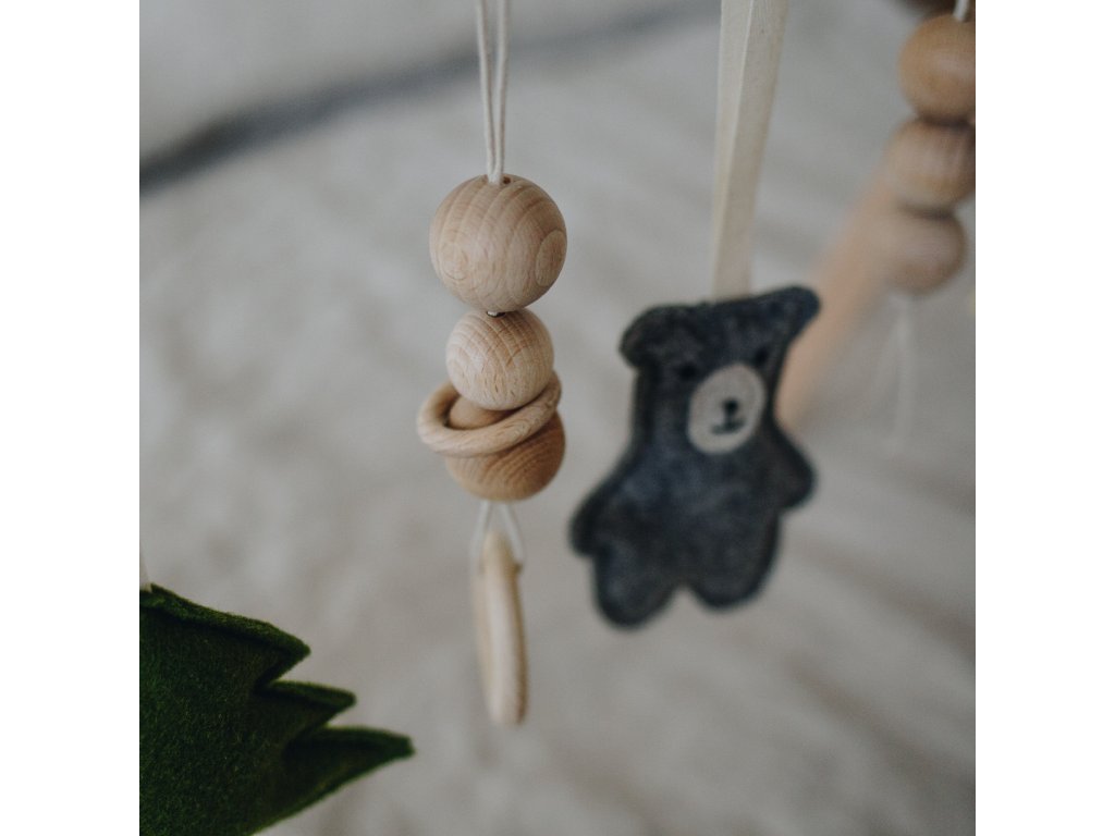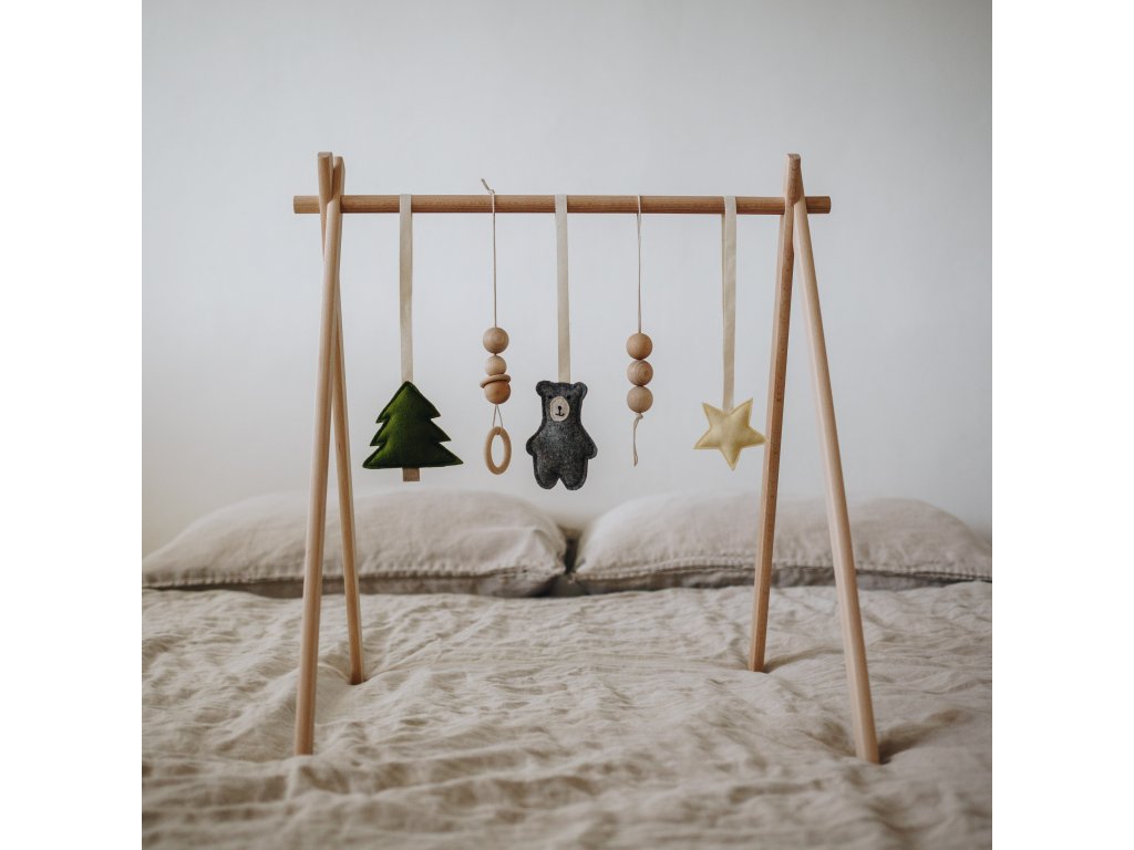 Sada pěti ručně šitých a dřevěných hraček na dětskou hrazdičku s vlněným ručně vyšívaným medvědem.