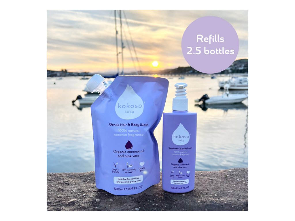 Úsporná a udržitelná náplň do Jemného mycího gelu na vlasy a tělo (500 ml) je nyní k dispozici v úžasné typické přírodní kokosové vůni, která čistí vaše dítě těmi nejlepšími přírodními ingrediencemi a zároveň pomáhá chránit životní prostředí.