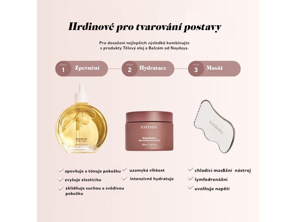 Nikdo nechce suchou masáž. Pro hladký zážitek z gua sha na těle použijte nejprve hydratační krém. Doporučujeme Zpevňující tělový olej Body Blitz od Naydaya.