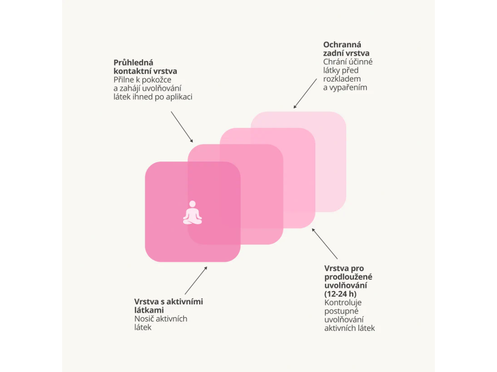Náplast je tvořena čtyřmi vrstvami, které zajišťují efektivní a rovnoměrné uvolňování účinných látek. Spodní vrstva obsahuje aktivní složky, další vrstva podporuje jejich vstřebávání, třetí vrstva se stará o postupné uvolňování a vrchní vrstva chrání složení před vnějšími vlivy.